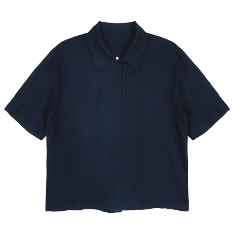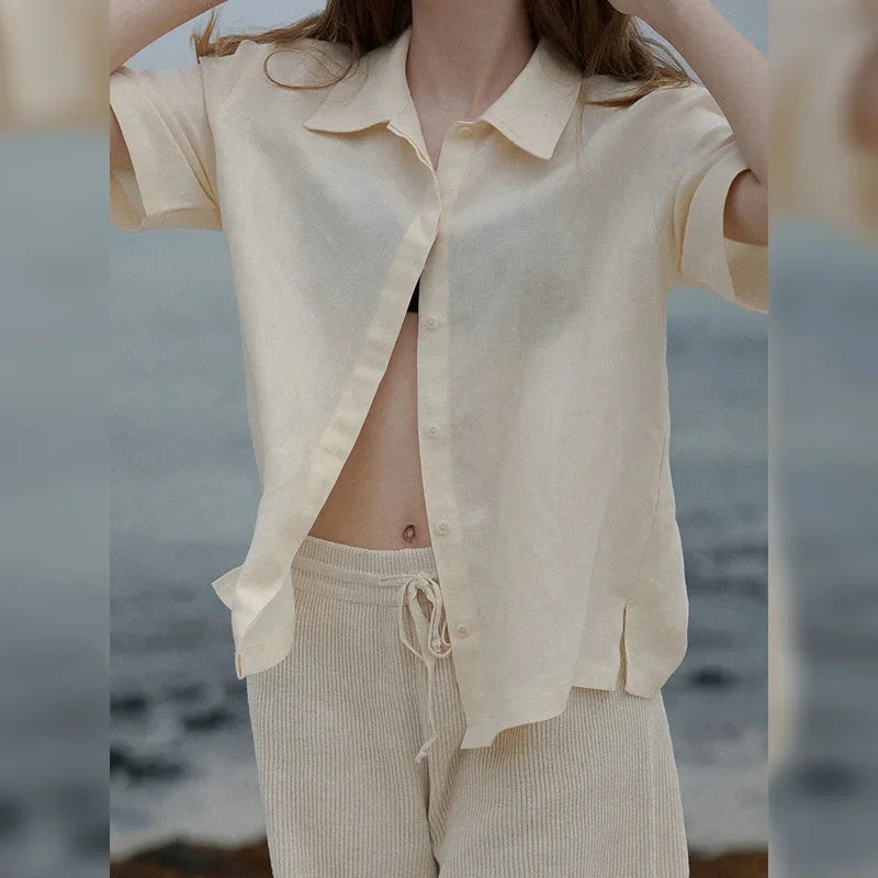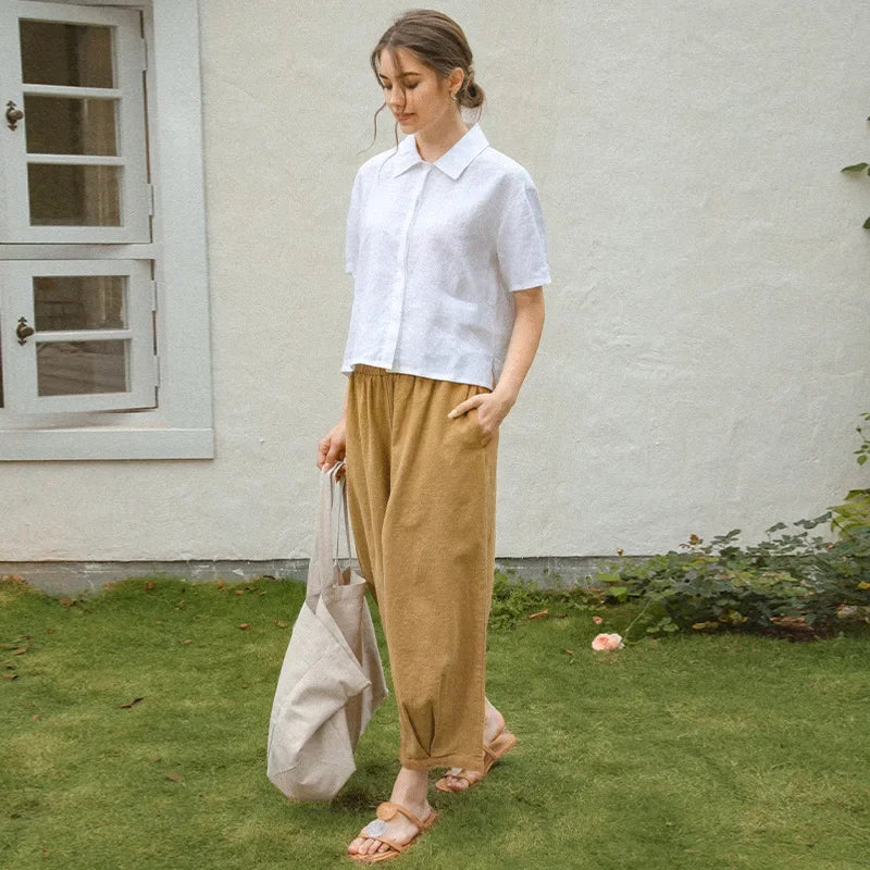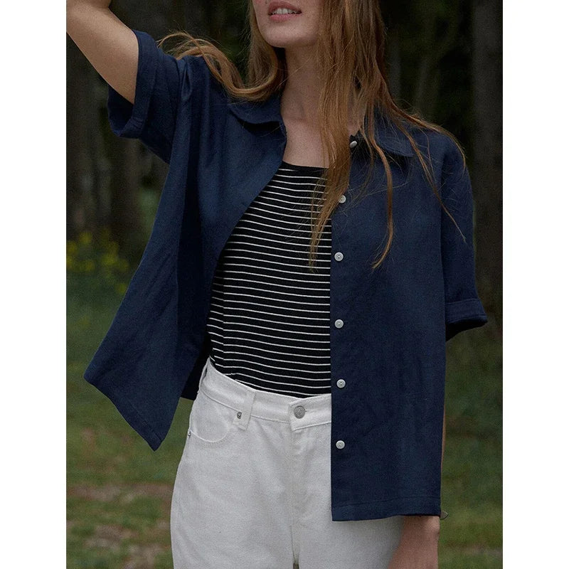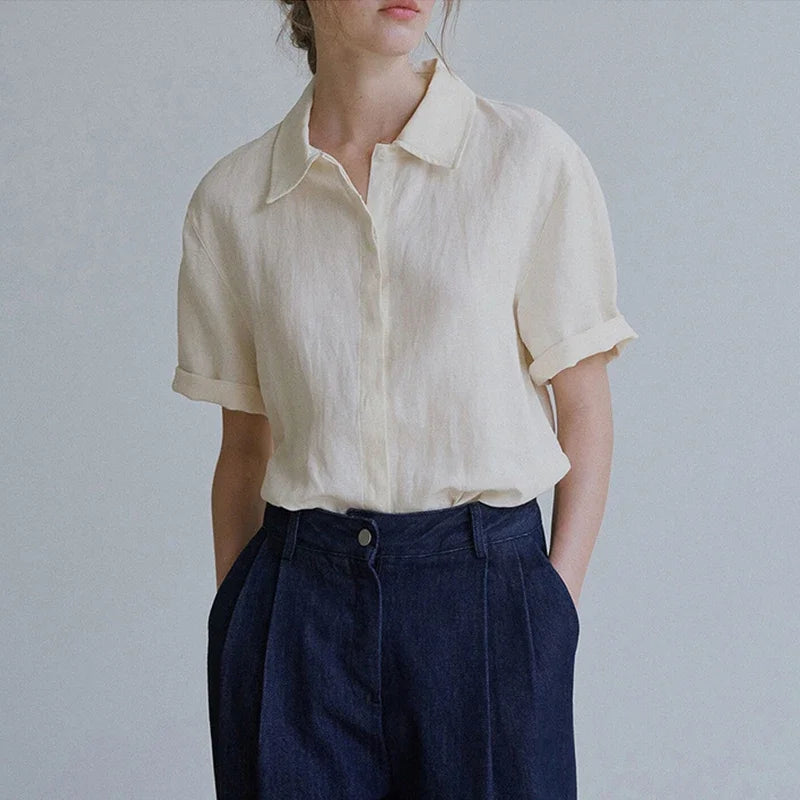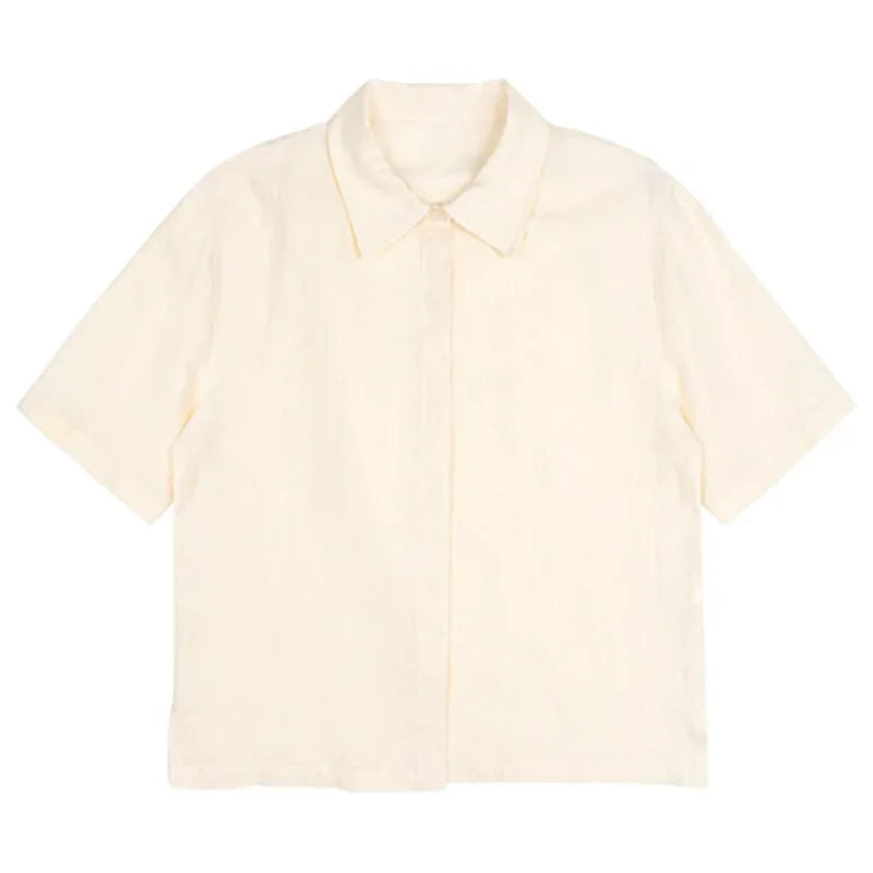 100% Linen Women's Short-Sleeved Shirts Summer New French Ladies Casual Loose Turn-Down Collar Single-Breasted Blouse